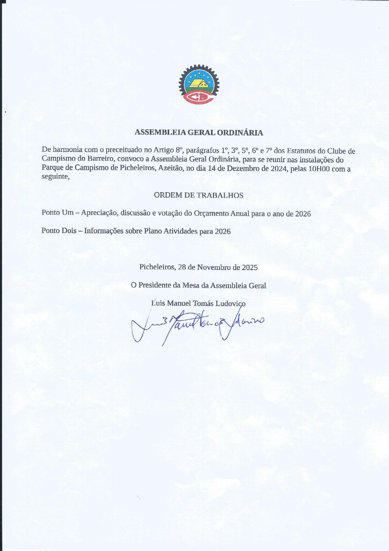 De harmonia com o preceituado no Artigo 8º, § Quinto dos nossos Estatutos, convoco a Assembleia Geral Eleitoral para o dia 24 de Fevereiro de 2023 às 19:30, na Escola Básica nº 4 no Barreiro, sita na Rua Prof. Joaquim Vicente França nº 103 com a seguinte,