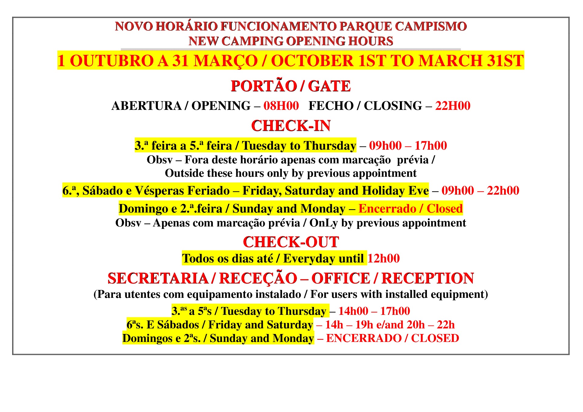 CHECK-IN – a partir das 15h CHECK-OUT – até às 14h